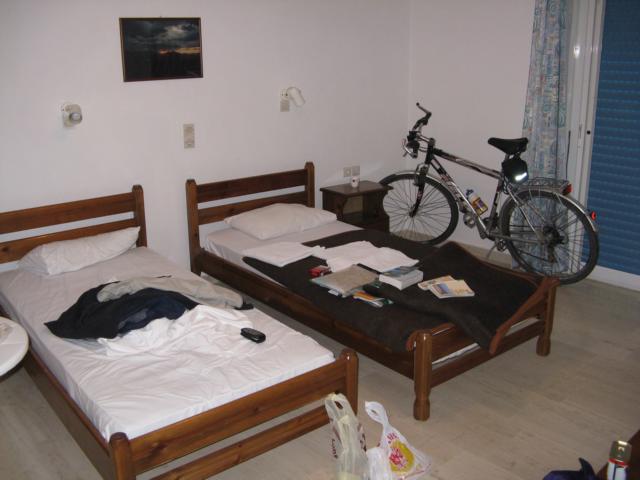 | Im Hafengebiet bei Fahrprüfungen zugesehen. Um 17:10 in Jugendherberge sehr freundlicher Empfang. 9,00€ / Nacht. 1. Halbzeit Spanien – Russland gesehen 2:0 dazu 2 Kaffee á 1,30€ getrunken. Danach in die Stadt gegangen zum Essen „ΟΨΑΡΑΣ“ neben der Kirche sah gut aus, ist aber Nepp. 6,-€ für einen Souflakispieß mit Pommes, 2 dünne Tomatenscheiben und etwas kaltem Reissalat. Besitzer zünden alle Kerzen auf den Tischen an, außer meiner. Ich glaube, sie reden über mich. Sie sehen sehr gelangweilt aus. Der 1. Eindruck hat getäuscht, insgesamt 11,50€. Um 21:00 zurück in Herberge. Ich bin um 22:00 ins Bett gegangen. Es war sehr laut auch von der Strasse. Um 23:00 kam der Herbergsvater sehr laut ins Zimmer und holte ein paar Decken. Andere waren auch sehr laut. Ca. 24:00 eingeschlafen. |